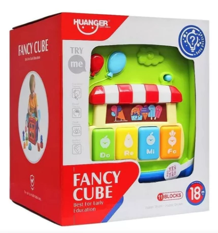 Cubo con 11 bloques de encastre, de diferentes formas y colores (letras, medios de transporte y formas), con piano, aros giratorios, espejo, reloj y una puerta, dando pie a diferentes actividades para que realice el bebé.