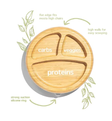El plato clásico está hecho de bambú orgánico. El anillo de succión de silicona extraíble se adhiere fuertemente a cualquier superficie dura para evitar derrames y derrames accidentales o intencionales.