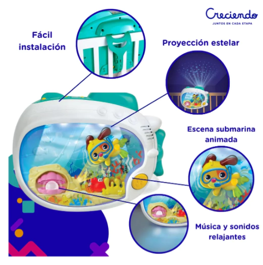 Escena submarina con elementos en movimiento que captan la atención del bebé.